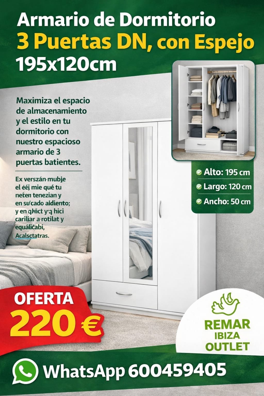 Gracias a su diseño contemporáneo, este armario juvenil o matrimonial se adapta fácilmente a dormitorios modernos, habitaciones minimalistas o decoraciones nórdicas, siendo una excelente opción para quienes buscan muebles funcionales en Ibiza con buena relación calidad-precio.